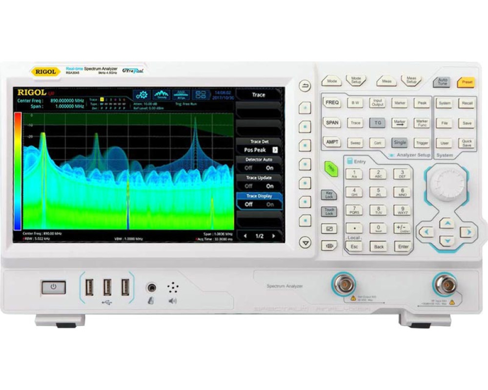 Режимы: анализатор спектра (GPSA) и анализатор спектра реального времени (RTSA). Полоса от 9 кГц до 4,5 ГГц. Технология UltraReal. Погрешность опорного генератора: 1 ppm (0,1 ppm). GPSA: полоса обзора: нулевая, от 100 Гц (от 10 Гц - опция) до макс. частоты; разрешение 2 Гц; фильтр ПЧ: 10 Гц...3 МГц (1 Гц…10 МГц опция), ЭМС фильтры; видеофильтр: 1 Гц…10 МГц; фазовый шум: -112 дБн @ 1 МГц; средний уровень собственного шума DANL: -141 дБм (без п/у), -161 дБм (с п/у, опц.); диапазон измерения: DANL...+30 дБм. RTSA: полоса захвата 10 МГц (25 МГц и 40 МГц опц.); мин. длительность событий 9,3 мкс (до 7,45 мкс -опц.), SFDR <-50 дБн/Гц, 6 типов окон. Цветной дисплей 10,1" (1024х600). Интерфейсы LAN, USB, HDMI. Размеры 410 х 224 х 135 мм, масса 4,65 кг.